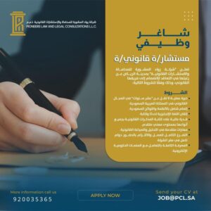 • خبرة عملية لا تقل عن 10 سنوات في المجال القانوني داخل المملكة العربية السعودية.
